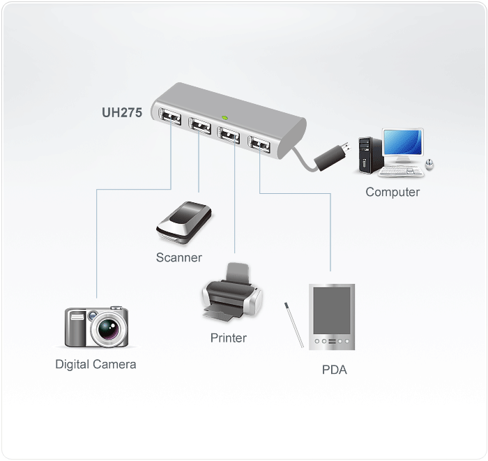 UH275 is a hub with 4 built-in USB2.0 ports. It has LEDs to indicate the connections status, and its handy and slim design allows users to carry it in pockets.
