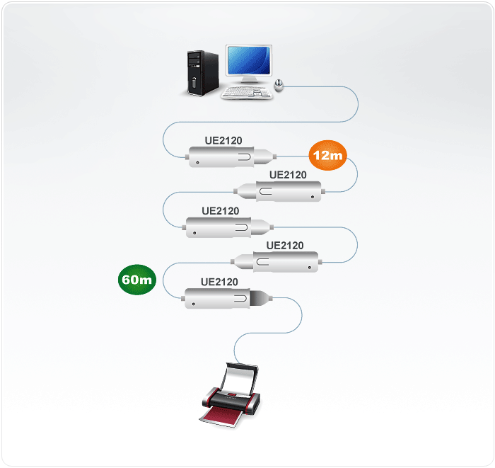 The UE2120 allows users to extend the distance between a computer and USB device up to 40 feet (12 m) via the active extender cable. USB signals transmitted through these cables maintain optimal signal integrity and meet USB 2.0 standards.