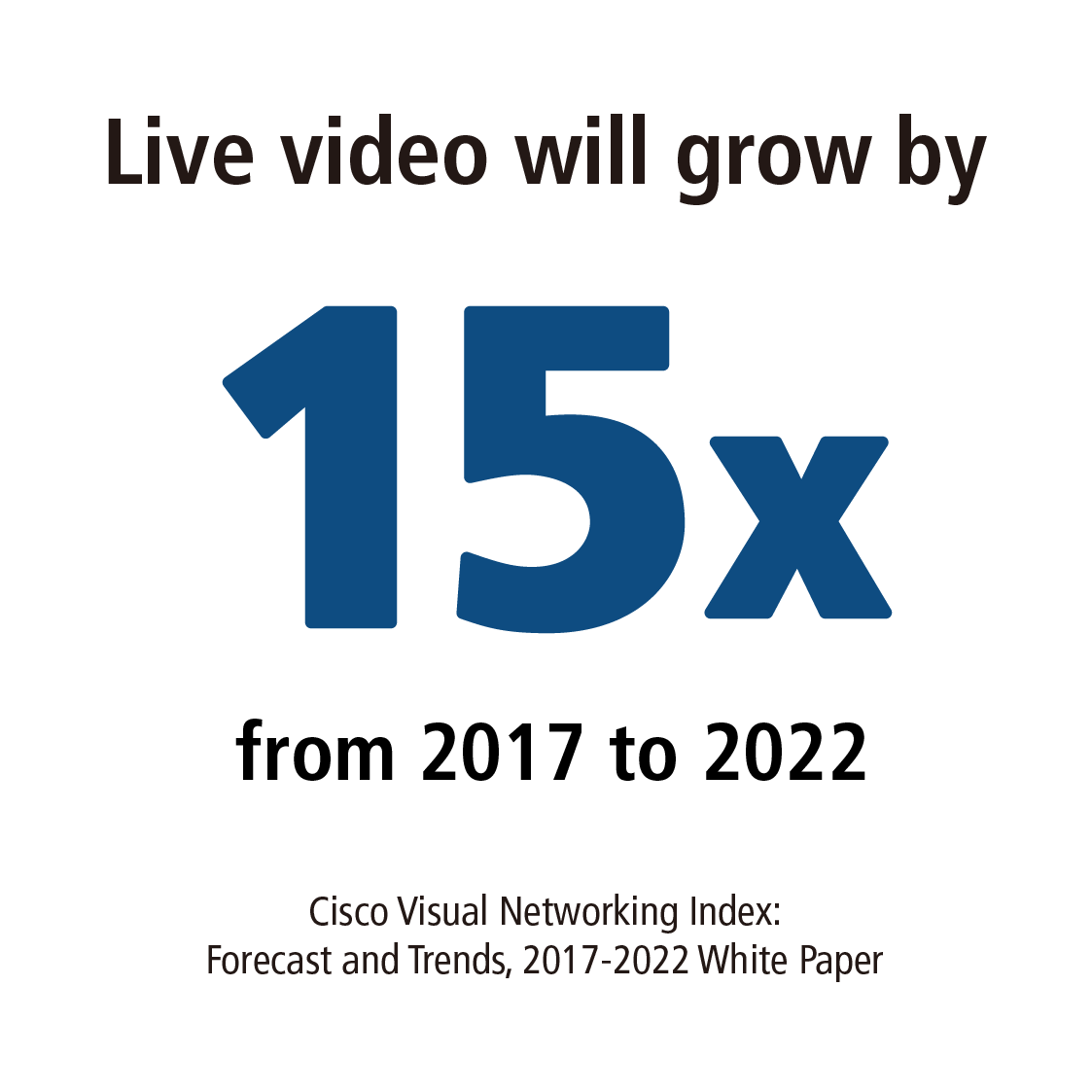 Livestreaming: It’s everywhere you turn these days, from Facebook to YouTube, Instagram’s IGTV, news sites, webinars, conferences, and more. Online video consumption at a 24/7 pace is becoming the new normal, and the fastest-growing video format continues to be livestreaming. In fact, video itself is expected to make up about 82 percent of all Internet traffic by the year 2022. The most common livestreaming applications include: