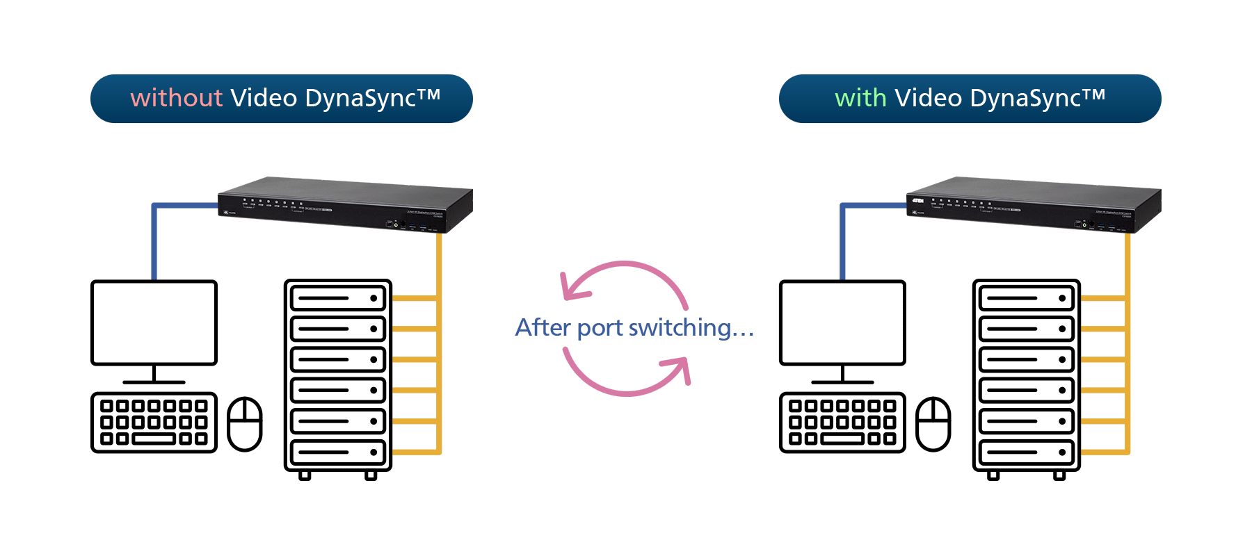 Empowered by patented ATEN technology – Video DynaSync™, Rack KVM Switches deliver a smooth viewing experience by maintaining the ideal video settings under all operating systems when switching between ports, speeding up switching between systems, and powering up uninterruptedly while eliminating boot-up display problems.