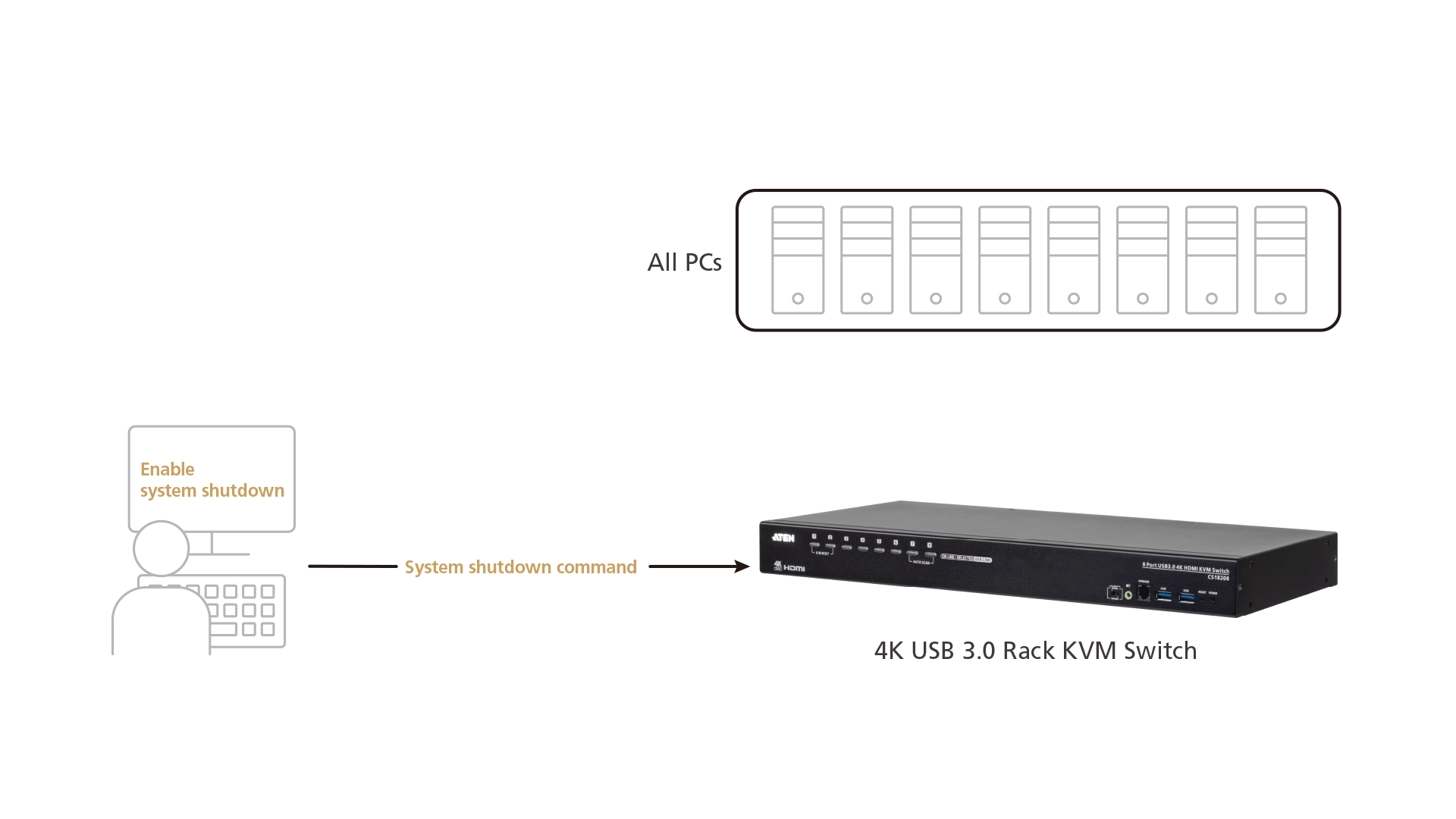 ATEN 4K USB 3.0 Rack KVM Switches (CS18208 / CS18216 / CS19208 / CS19216), featuring superior 4K video quality, USB 3.0 peripheral agility, and space-saving rackmount capability, allow 8 or 16 computers to be centrally controlled via a single console where IT engineers are enabled to expedite system operations by configuring multiple units simultaneously instead of working one at a time; routine or repetitive tasks and procedures can be promptly replicated and broadcasted on multiple computers in seconds, slashing time, space, and cost, while pursuing strengthened enterprise productivity.