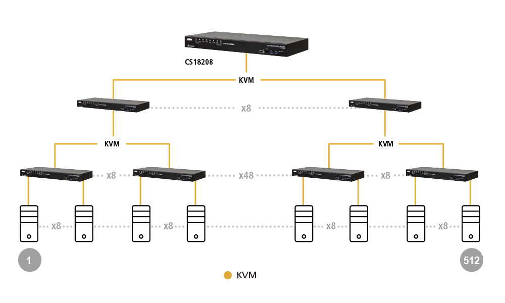 By connecting computers to a 4K USB 3.0 Rack KVM Switch, the number of connected computers can be scaled up to 256 by cascading the CS19216 in 2 levels, or 512 by cascading the CS18208 in 3 levels, leaving room and flexibility for network expansion when needed.