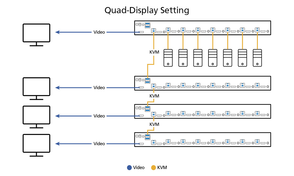 When a large amount of complex content needs to be viewed at once or there’s a need to examine intensive data for analysis, up to 8 Rack KVM Switches can be stacked up to allow up to 8 monitors to be set up in a multi-display configuration (such as dual- / triple- / quad-display) to facilitate live feeds among computers at the console desktop.