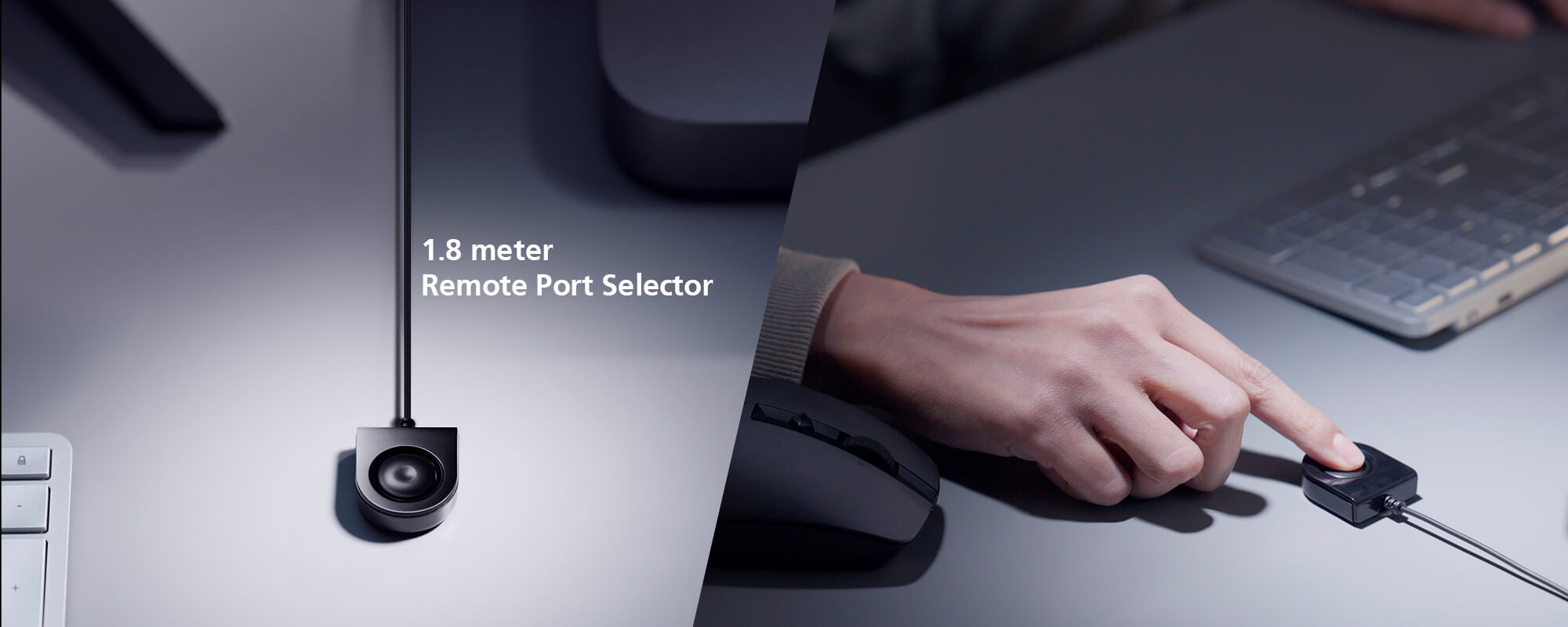 The 1.8-meter remote port selector can be flexibly located, allowing quick and straightforward switching between 2 computers from anywhere on the desktop.
