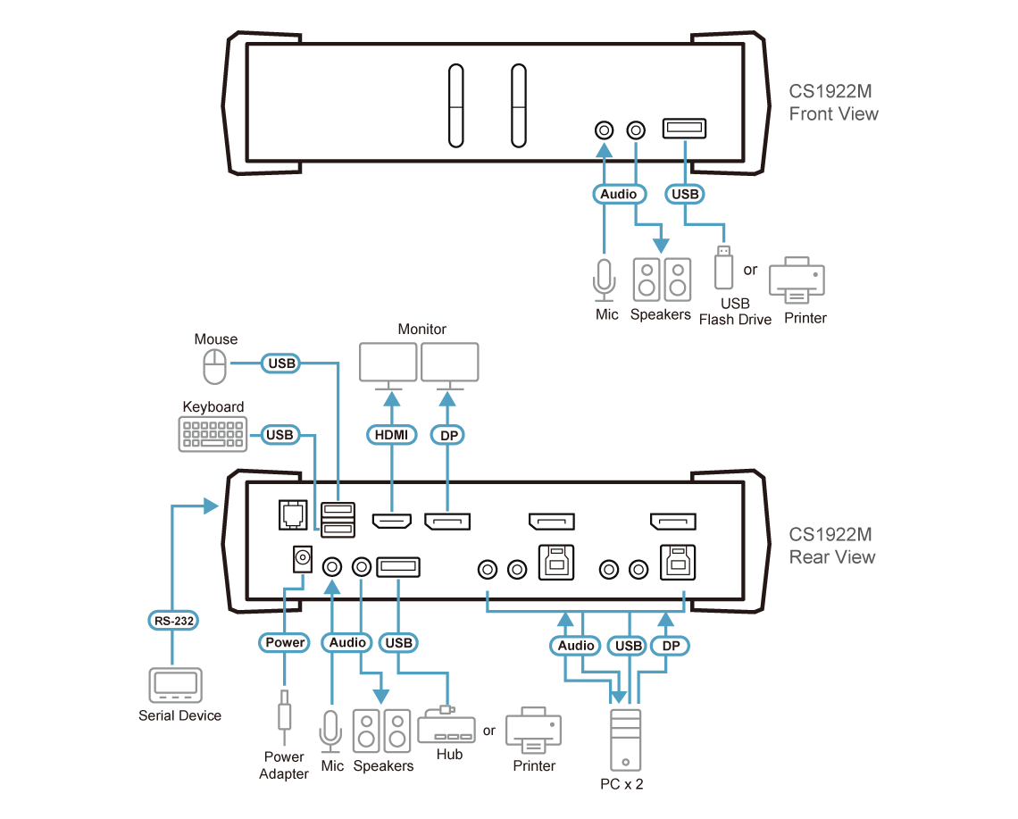 - One USB keyboard/mouse and DisplayPort or HDMI monitor control 2 computers and 2 USB peripherals