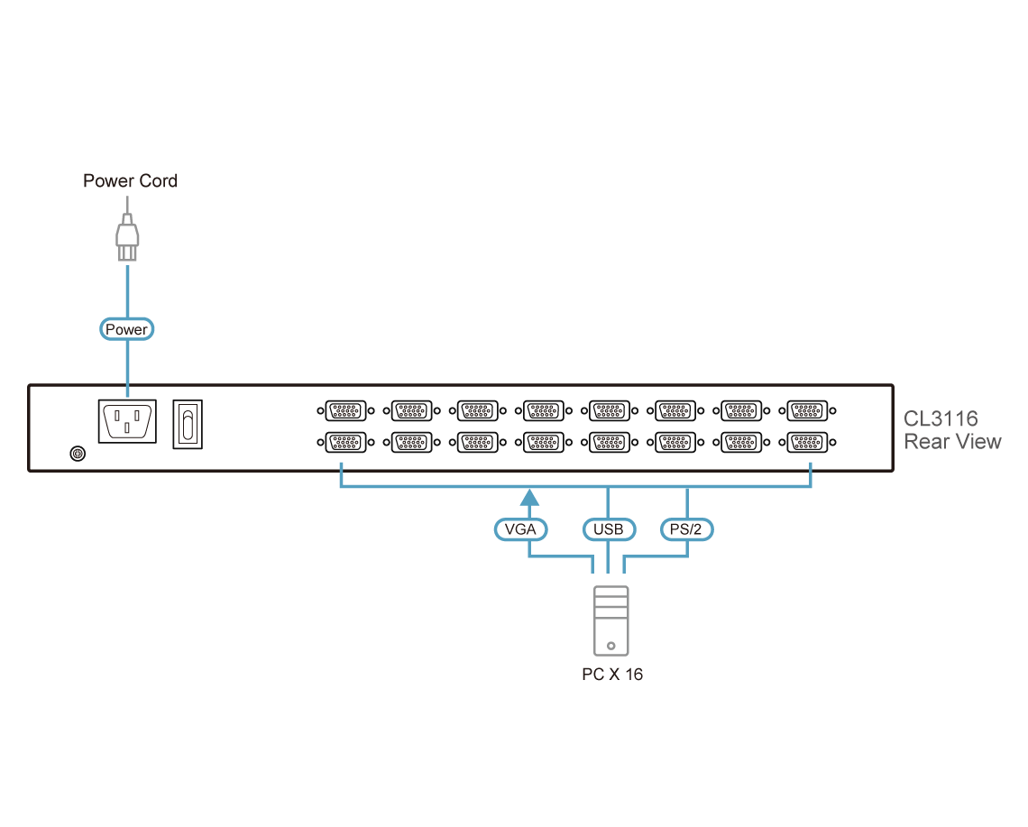 - Cascade up to 2 levels – CL3116 controls up to 256 computers from a single console