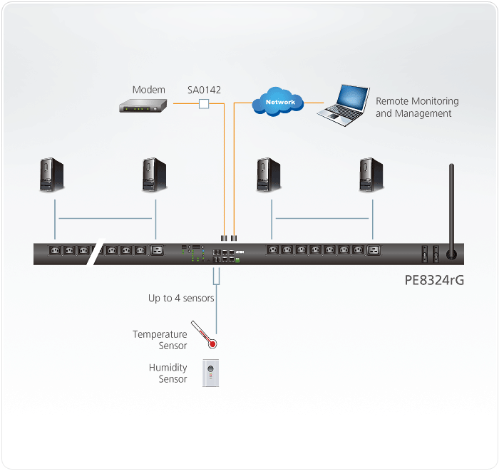 - Environment monitoring – supports external temperature/temperature & humidity sensors for rack temperature and humidity monitoring