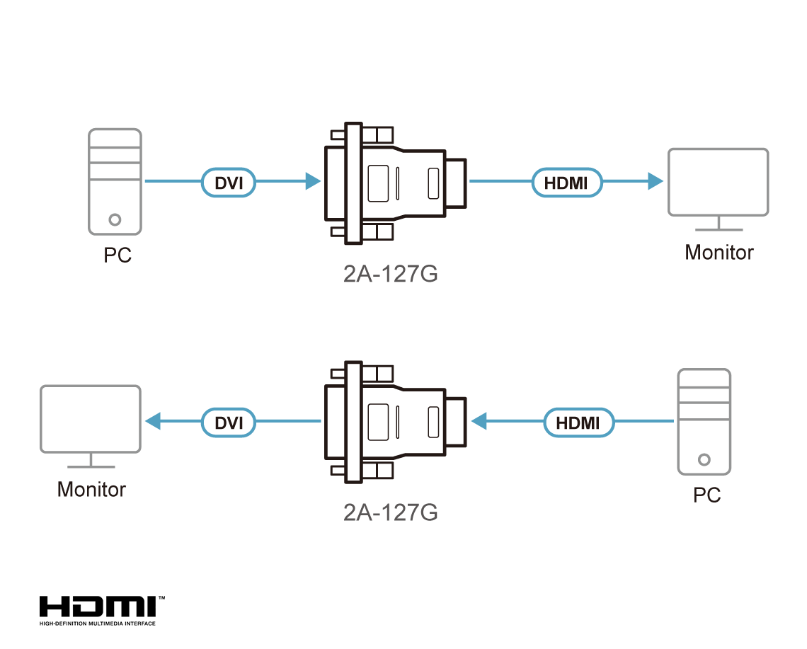 The 2A-127G DVI to HDMI Converter is a bi-directional converter that allows you to connect an HDMI display to a device with a DVI-D display output, or display an HDMI signal on a DVI monitor.