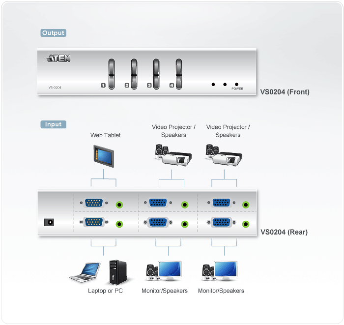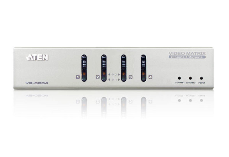 - Each of the 4 video outs can toggle between Source 1 and Source 2 using front panel pushbuttons